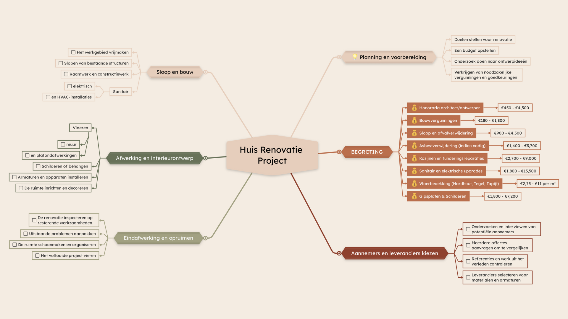 Een huisrenovatie brengt talloze beslissingen met zich mee. Wanneer begin je met de sloop? Wie levert het keukenblad? Zijn de tegels op tijd binnen? Wie houdt het budget in de gaten? Het zijn precies deze overlappende taken en afhankelijkheden die renovaties zo gevoelig maken voor vertragingen en miscommunicatie. Door het project visueel te benaderen met een mindmap, worden al deze elementen zichtbaar in één oogopslag. In plaats van te werken met losse documenten, apps of notities op papier, bouw je aan een overzichtelijke boomstructuur waarin elke tak staat voor een thema: van ontwerp tot oplevering.